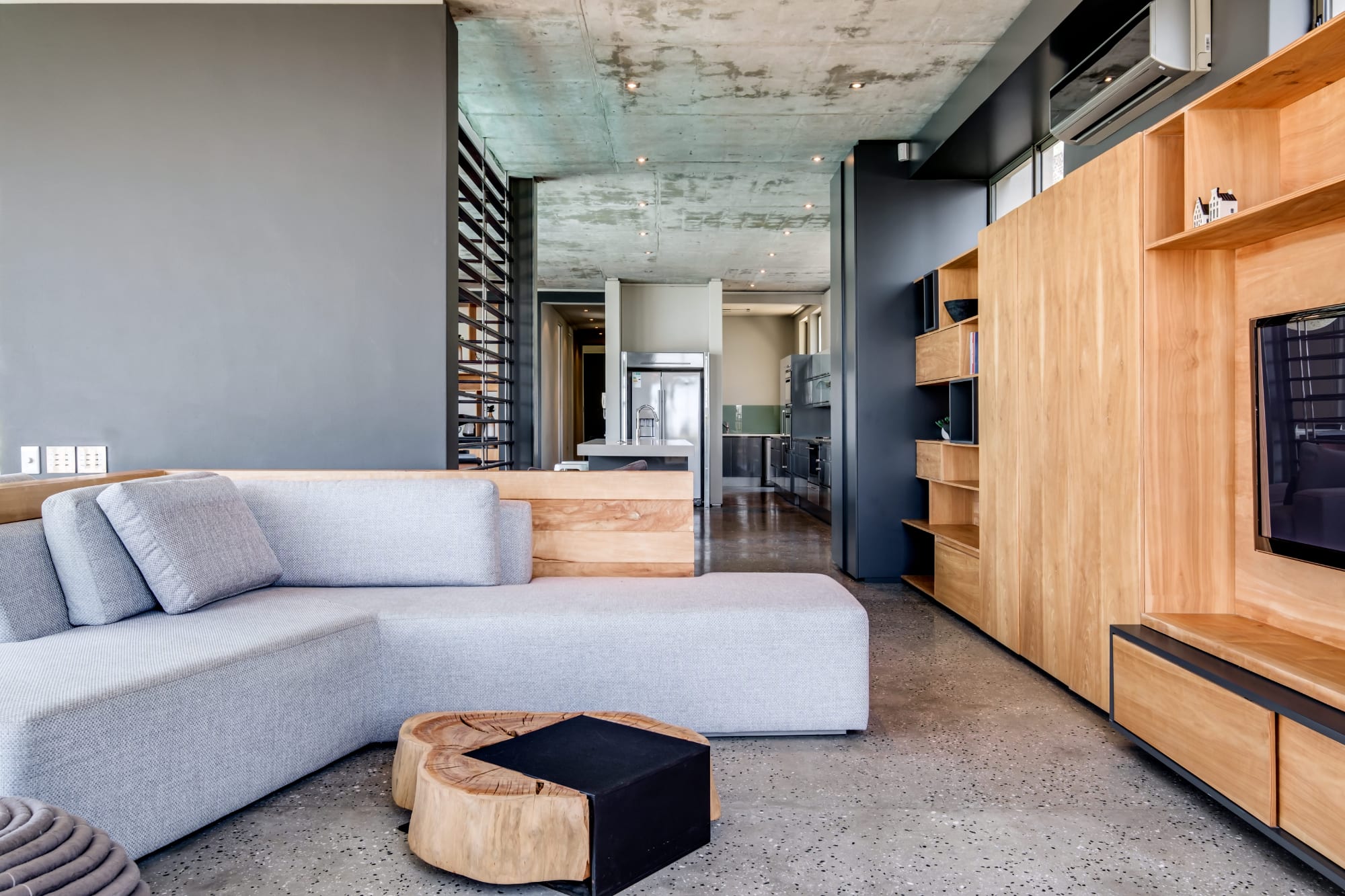 There is an open-plan kitchen with breakfast bar which flows into the living and dining areas. There's a gas fireplace and dining for 8.