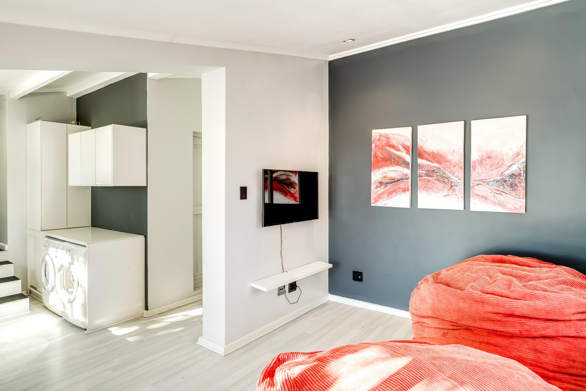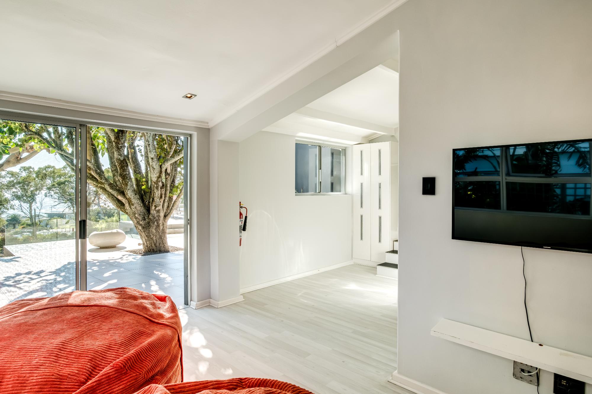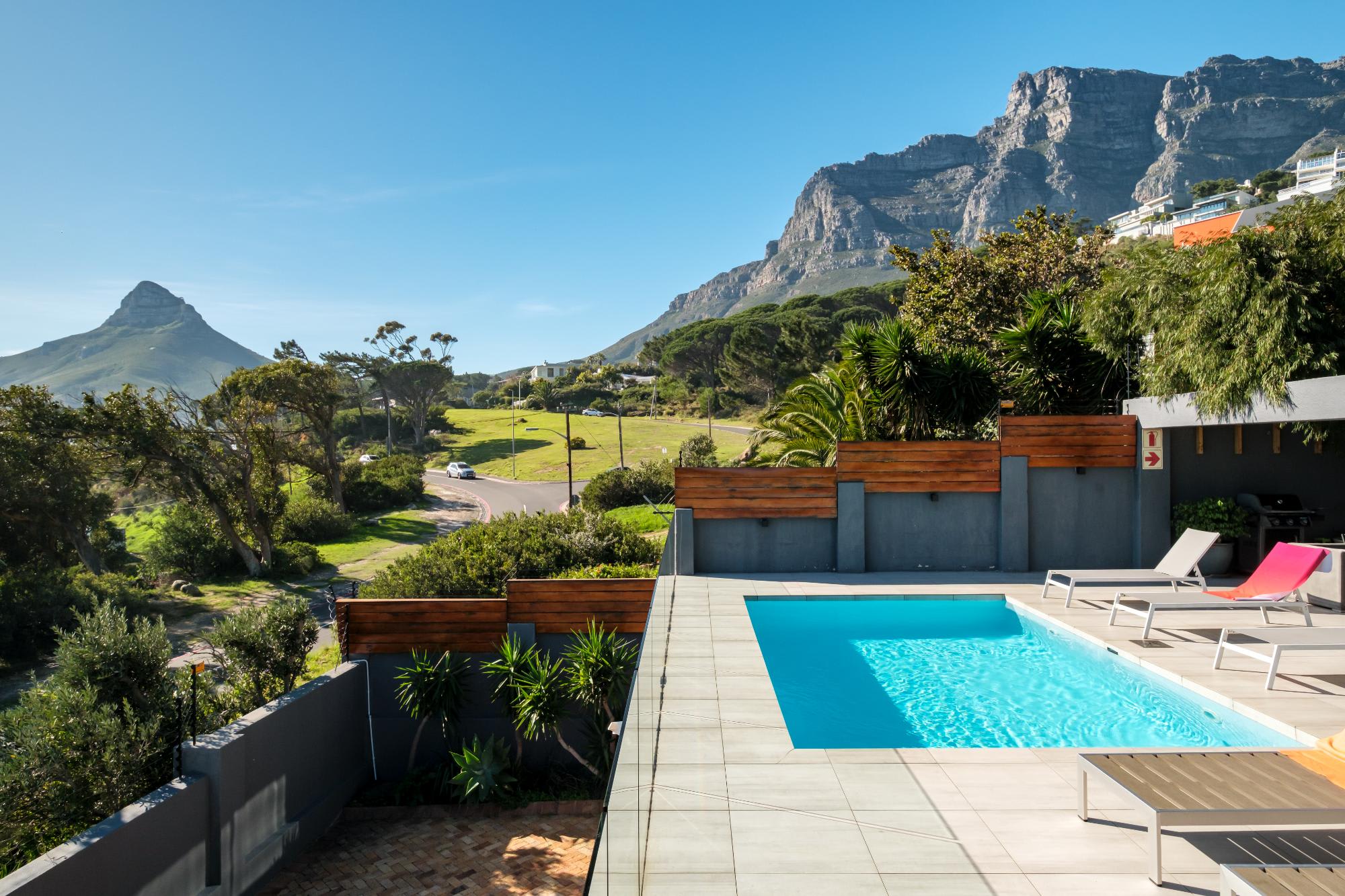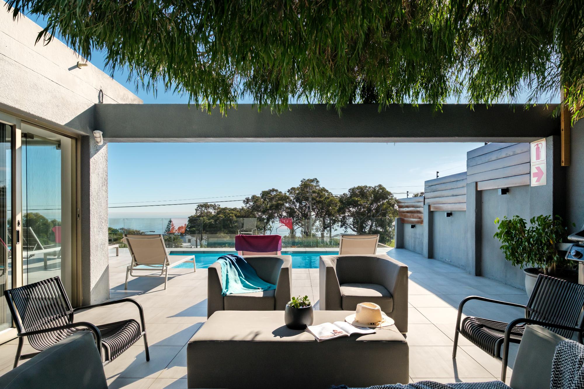 The open-plan living and dining area, with seating for five and a large dining table, opens to a pool deck with sea views. A TV room offers a relaxed space to unwind. The kitchen is fully equipped with modern amenities, including a gas hob, Nespresso machine, and dishwasher. Outdoors, the pool and sun loungers invite relaxation, while a gas BBQ is ideal for al fresco dining. About a 10-minute walk to Camps Bay Beach and a 5-minute drive to Table Mountain Cableway, Valtameri provides both peace and easy access to Cape Town's attractions.