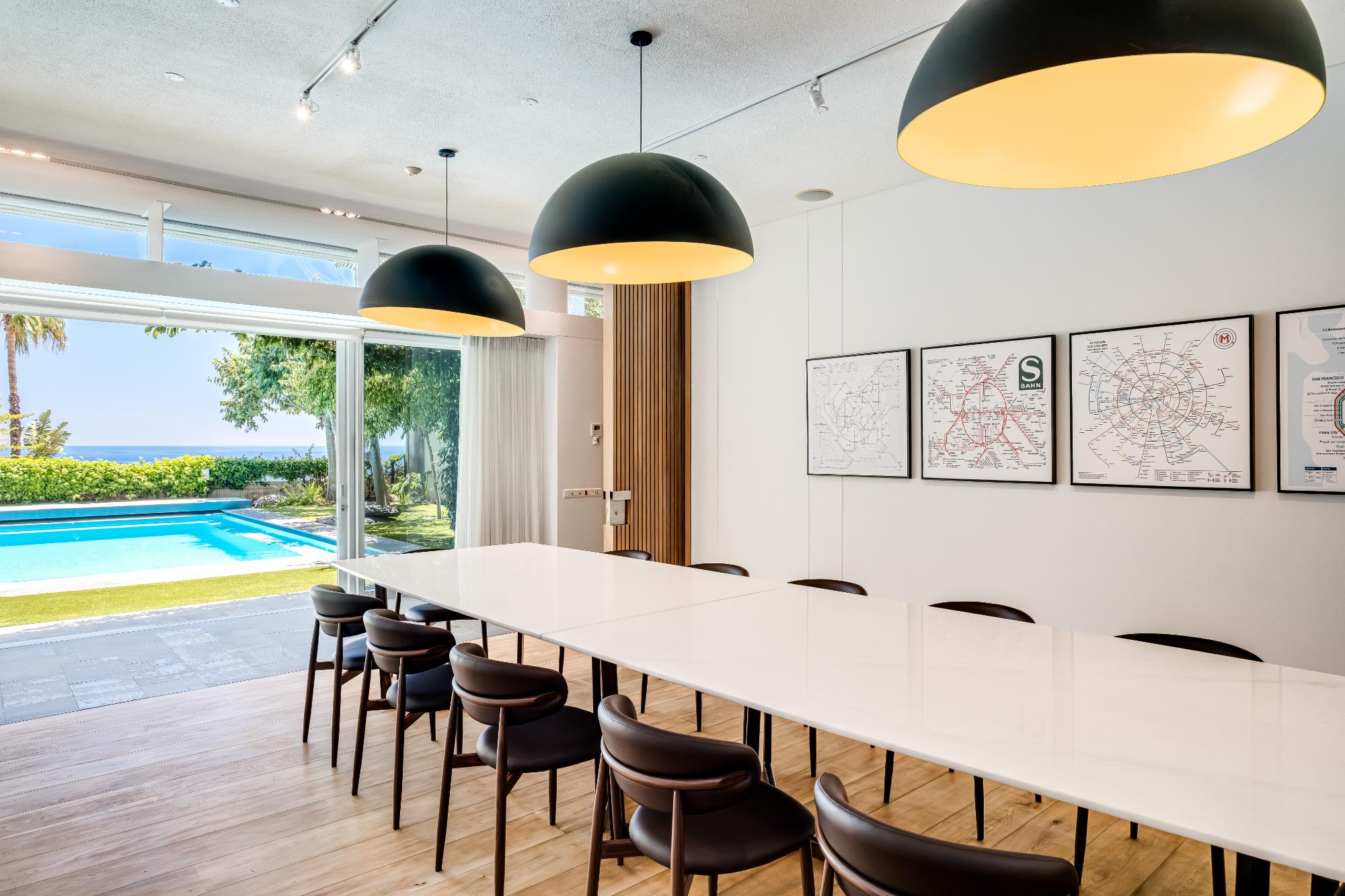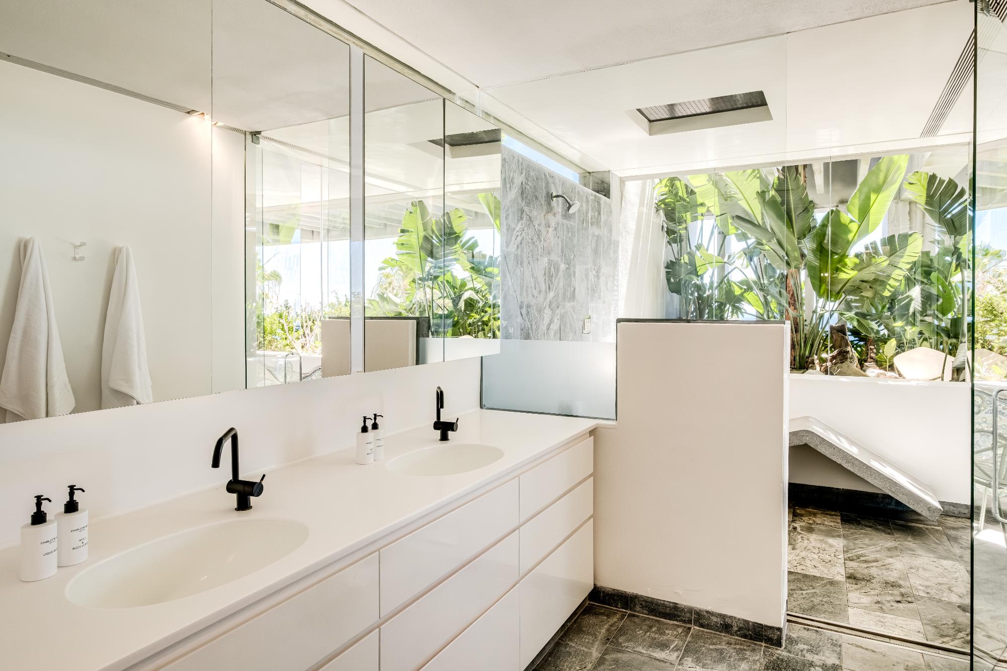 Leonotis Villa found in the heart of Fresnaye, combines a modern concrete aesthetic with luscious exteriors and an oppulent indoor–outdoor flow. The generous garden spaces and wide sea and mountain views shape the atmosphere across the expansive property. Designed for groups and high-end living, the villa includes multiple lounges, entertainment rooms, a cinema, library, gym and boardroom. Many of these spaces connect smoothly to the pool, upper decks and outdoor dining areas.